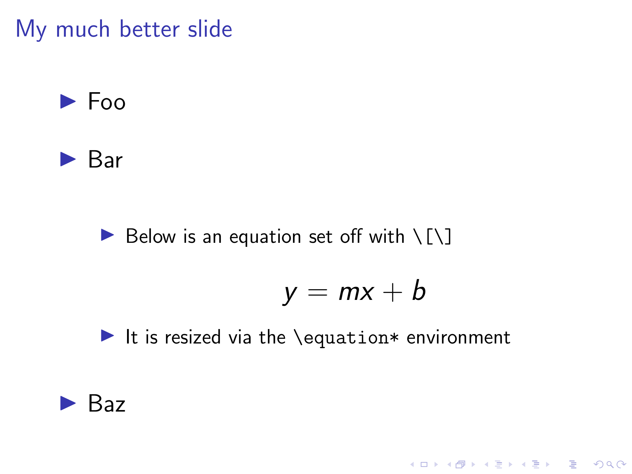 Now we’ve got a much more readable slide that will be automatically replicated for every other slide in our presentation. If you have multi-line equations in your slides, you can similarly redefine the align* environment to enlarge these equations as well.