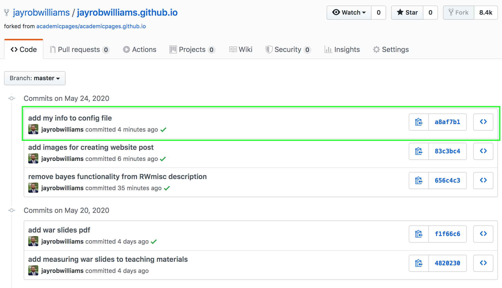 Now, here’s where things may get a little tricky. Go to http://<yourusername>.github.io/ and see if there’s a website there. If there is, skip down to the last section below. If not, go back to the settings page for your repo and see if there’s still a “ready to be published” message. If there is, you may have to push an additional change to the repo to trigger building your site. Editing _pages/about.md to personalize the welcome message and short biography is a good candidate here. Once you’ve personalized your site’s landing page, record the changes and push them to the repo
